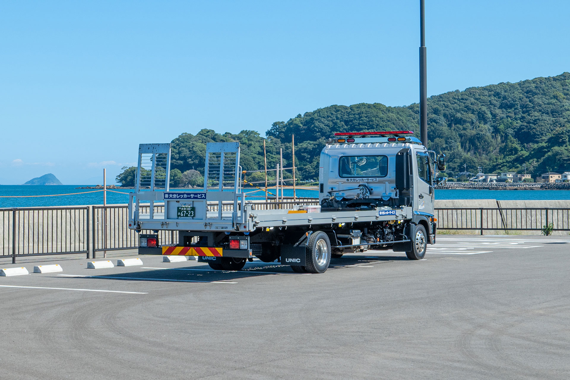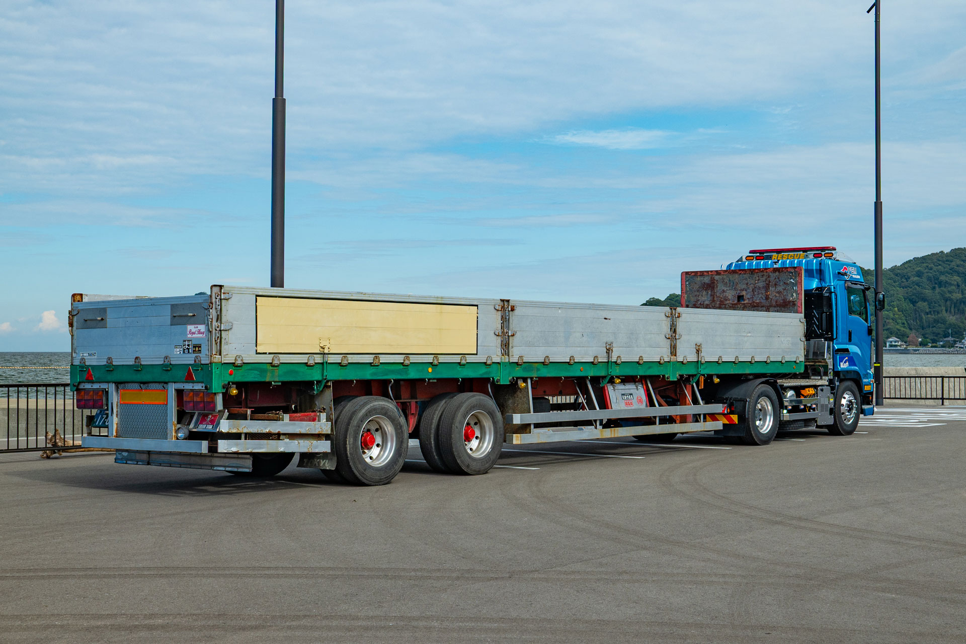 ・極東フラトップ5.7m・タイヤ固縛・エアーコンプレッサー
